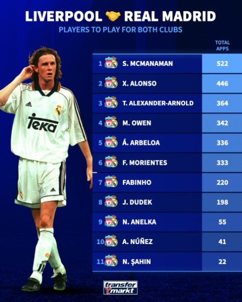 11月5日訊 作為歐洲足壇兩大豪門,利物浦和皇馬曾吸引諸多球星效力。德國轉(zhuǎn)會市場盤點(diǎn)了在兩隊(duì)均有效力的球員總出場次數(shù)排行,麥克馬納曼為兩隊(duì)共出場522次居首,皇馬主帥阿隆索則以446場位居次席。